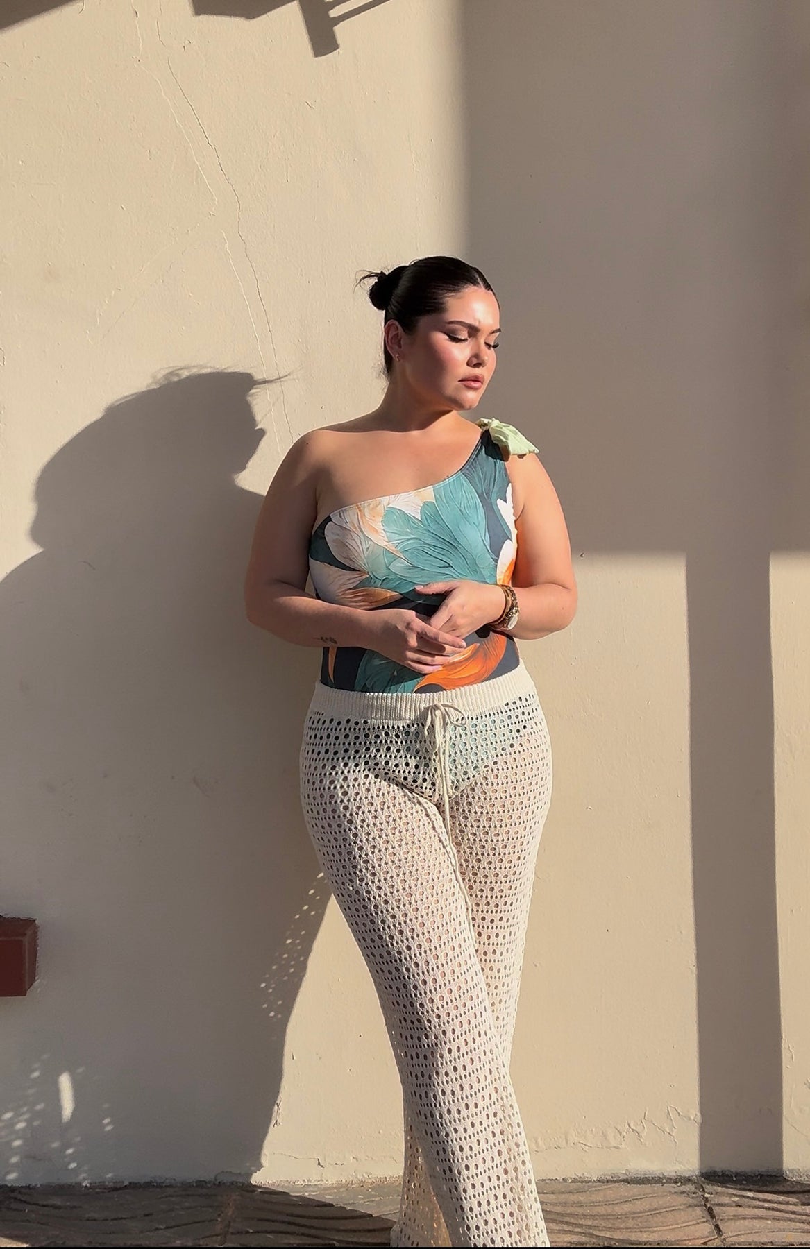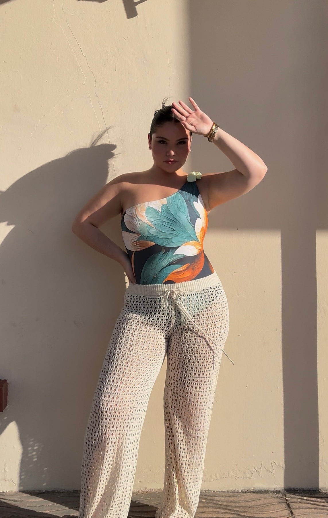 Un diseño fresco y sofisticado que combina un estampado floral en tonos verdes y azules con un corte one shoulder que aporta elegancia y modernidad para un look resort impecable.