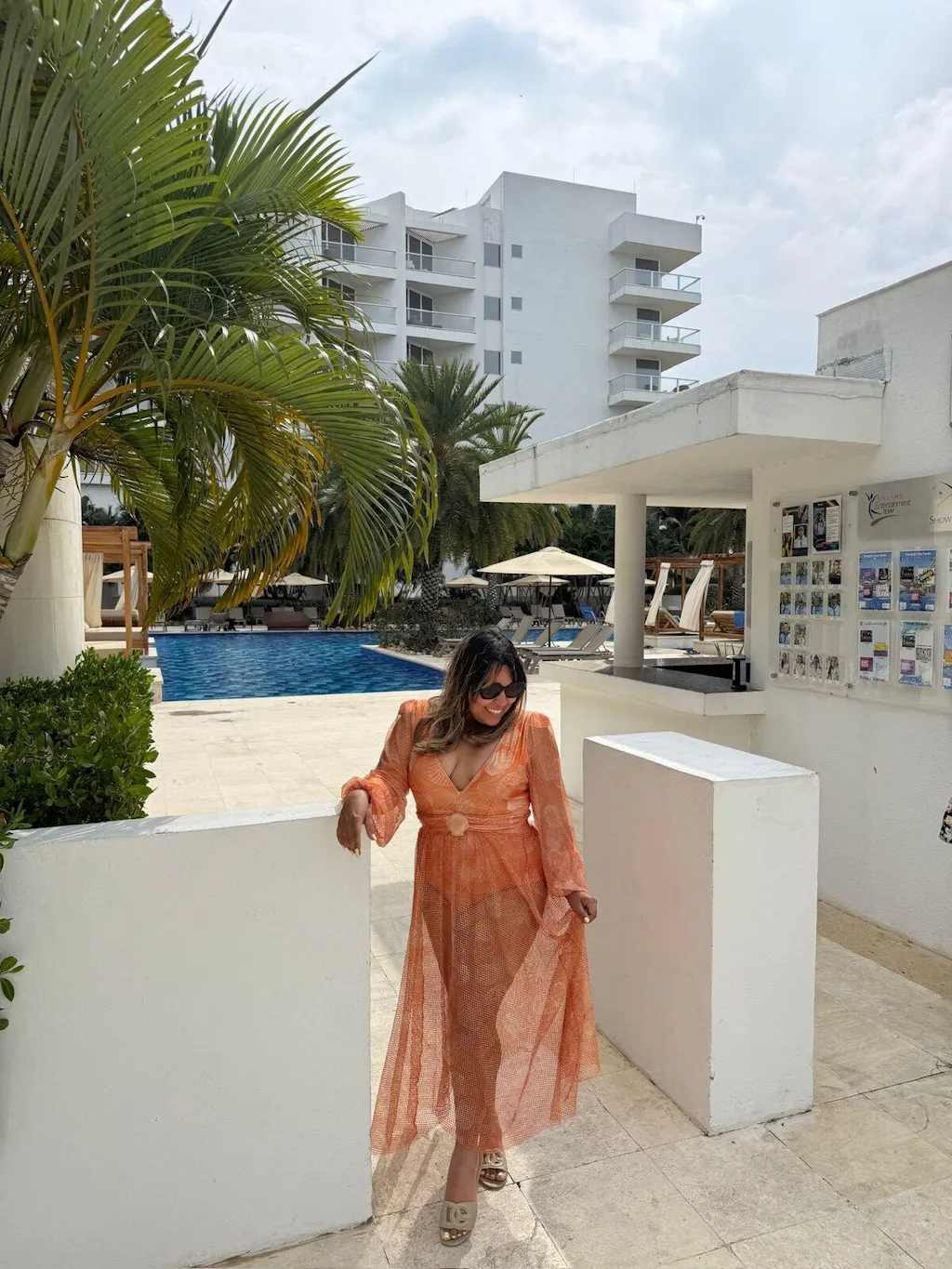 Un look playero premium que combina elegancia, frescura y un toque dorado inspirado en el Caribe. Perfecto para lucir radiante, sofisticada y con estilo en cualquier destino de sol.